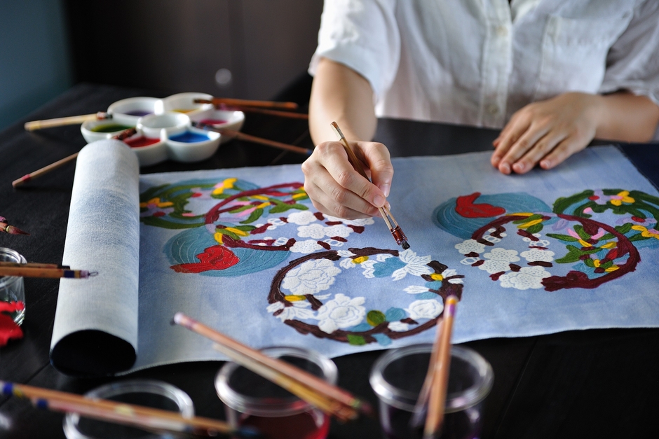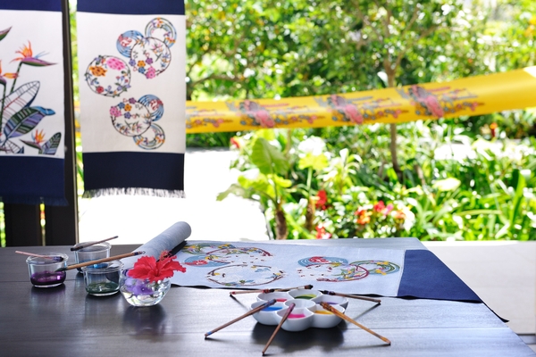 紅型の制作は、緑豊かな庭に面した客室のプライベート空間で、職人の指南を受けながら行います。制作に使用する型は「琉球びんがた事業協同組合」の監修で制作したオリジナルデザインです。梅や牡丹、祝いや祈りが込められた紅型の伝統的なモチーフとあわせて、海や沖縄らしい植物をモダンにアレンジしました。作業は「型置」「色挿し・隅取り」「水元」と幾つかある紅型独特の工程から、「色挿し・隈取り」を体験します。庭巡りや深呼吸で目に触れた色や景色、その時に感じた思いを表現します。最終工程の「水元」は手順書をもとに自宅で行います。染色用に塗られた糊を丁寧に取り除くと驚くほど色鮮やかな模様が浮かび上がり、沖縄の情景が蘇るようです。