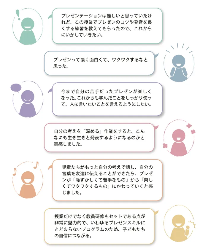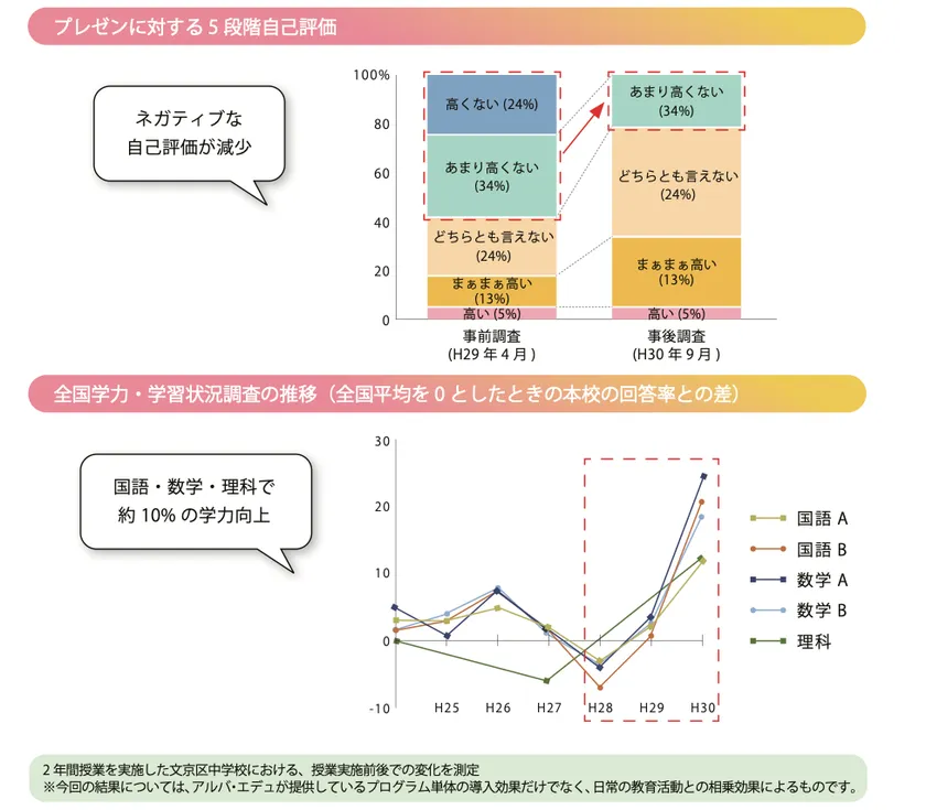 過去にプログラムを実施した研究指定校では、「プレゼンに対するネガティブな自己評価が減少」、さらに「国語・数学・理科で約10%の学力向上」という結果も出ています。