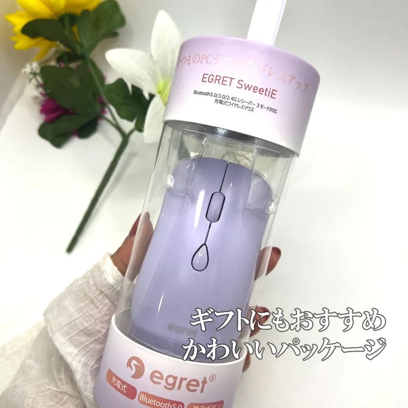 EGRETは本体だけでなく、同梱品やパッケージもおしゃれです。透明の円筒状パッケージはまるでお菓子や化粧品の様、PC作業の多い女子へのプレゼントとして最適です。