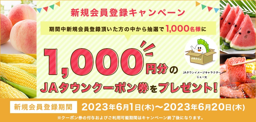 内 容:期間中、JAタウン新規会員登録頂いたお客様の中から抽選で1,000名様に1,000円分のJAタウンクーポン券をプレゼント