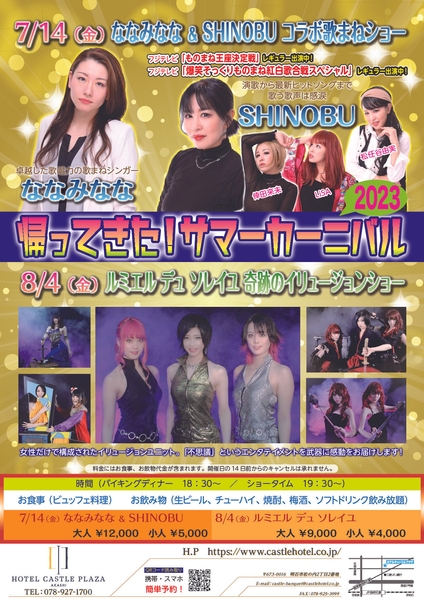 株式会社キャッスルホテル(本社:兵庫県明石市松の内2‐2、社長:成田良伸)は3年ぶりにサマーカーニバルを復活させ、系列の西明石ホテルキャッスルプラザ(所在地:同)で2日間にわたって開催いたします。7月14日(金)はTVで人気のものまねタレントさんによるショー、8月4日(金)は女性だけで構成された奇跡のイリュージョンショー。両日ともビュッフェ形式によるバイキングディナーをご用意しており、大人からお子さままで幅広い世代にお越しいただき、ホテルならではのショータイムを満喫してください。