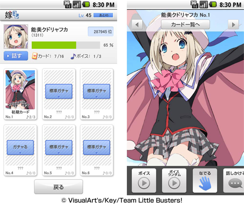 BIGLOBEは5月28日より、アニメやゲームキャラクターの録り下ろしボイスが聴けるカードコレクションアプリ「嫁コレ」(iPhone及びAndroid(TM)向け)(注1)に、アニメ『リトルバスターズ!』の“能美クドリャフカ”と、アニメ『神様はじめました』の“瑞希”を追加します。また、『リトルバスターズ!』の“棗鈴”“神北小毬”“三枝葉留佳”と、『這いよれ!ニャル子さん』の“ニャルラトホテプ”に、未公開のカードを追加します。