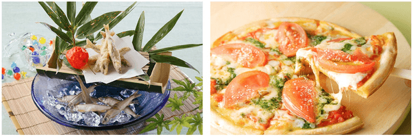 右:地元飛騨産のトマトを使用したピッツァ。トマトの酸味とバジルの爽やかな味わいが夏にぴったりの美味しさです。