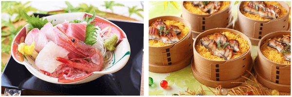 右:夏のエネルギー補給にはやっぱりうなぎ。敷き詰めた錦糸卵の上にうなぎを乗せ、わっぱで蒸しあげてご提供します。