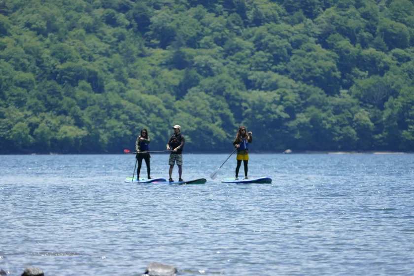 サーフィンのロングボードのような大きめのボードに乗り、パドルで水面を漕いで進むウォーターアクティビティです。