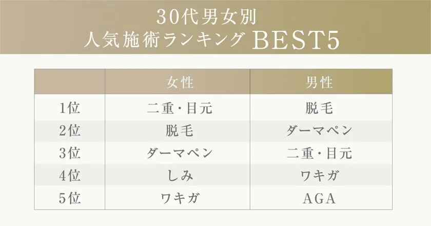 美しさと自信を手に入れる!30代男女が選ぶ最新美容トレンド! 「30代男女の人気施術ランキング BEST5」発表