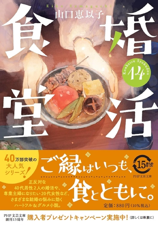 『婚活食堂』の舞台「めぐみ食堂」の名物である「おでん」が、山口恵以子さんと紀文食品とのご縁をつなぎました。紀文食品の堤裕社長から「おでん屋を舞台にした小説『婚活食堂』の作者・山口さんと会ってみたい」という連絡を受けた同社の広報担当者が、弊社を介して山口さんにラブコール。山口さんも、紀文食品の看板商品「竹笛®」が大好物で、学生時代は、毎朝主食代わりに食べていたほどだったと本書で明かしており、「相思相愛」だったことから対面が実現しました。その後、紀文食品が運営するおでん専門WEBメディア「オデンガク」の連載として「婚活食堂――おでんと肴とお酒――」がスタート。作品中に登場するおでん一品と料理一品、それにお酒を組み合わせて写真とともに紹介する連載は、現在も同メディアの人気コンテンツとなっています。この連載を小説の最新刊『婚活食堂14』と同時にオリジナル文庫として刊行し、PHP文芸文庫創刊15周年に花を添える運びとなりました。