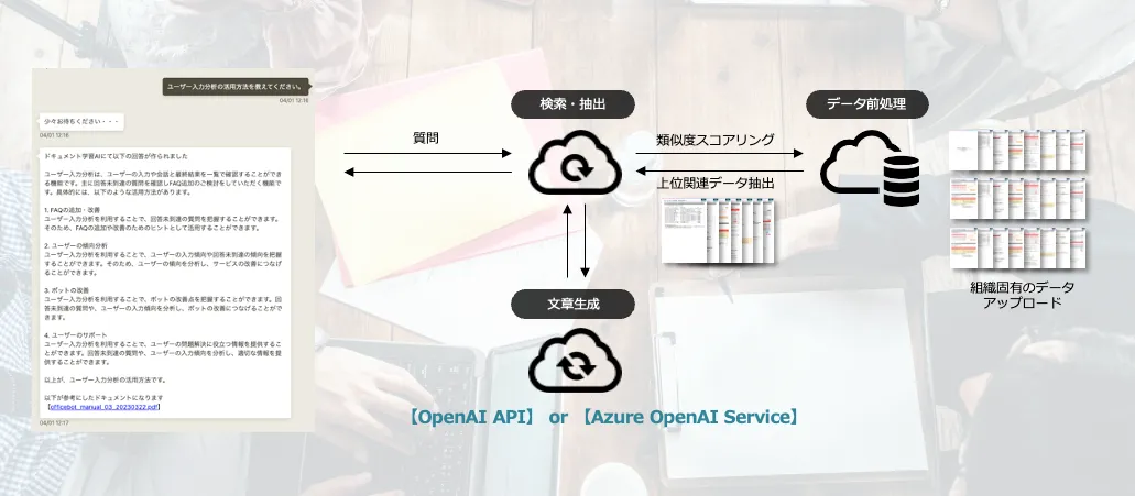 【OfficeBot】は、組織内の問い合わせ対応やナレッジ共有を効率化するサービスとして、業種問わず多くの企業でご利用いただいています。本年4月には、AIの研究開発を推進する米国OpenAI社が提供する「OpenAI API」と連携し、より高度な自然言語処理能力を備えた【OfficeBot】 powered by ChatGPT APIとしての提供を開始いたしました。社内規定や製品マニュアルなどのドキュメントから、FAQ、問い合わせ履歴、Webサイトの情報に至るまで、組織固有の幅広い情報をもとに、従来以上に高度な質問応答が可能なチャットボットとして提供しています。