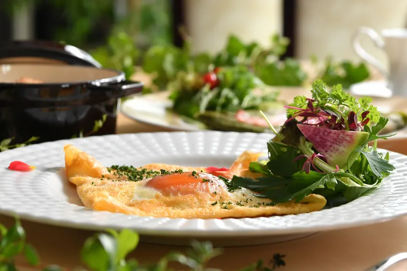 佐賀の銘酒で愉しんだ翌日の朝食では佐賀のこだわり食材で作る「SAGAガレット」など、佐賀をゆっくりと感じていただく至福の時間を、こだわりの空間でお過ごしください。