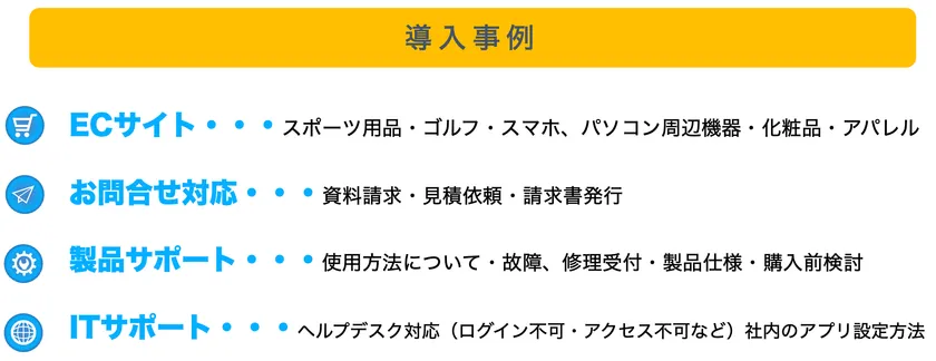 スポーツ用品卸業者、パソコン・スマホ周辺機器、携帯キャリア・ショップ、化粧品メーカー、製造業者、ITヘルプデスク、オリジナルグッズ販売店、EC販売サイト、警備保証会社