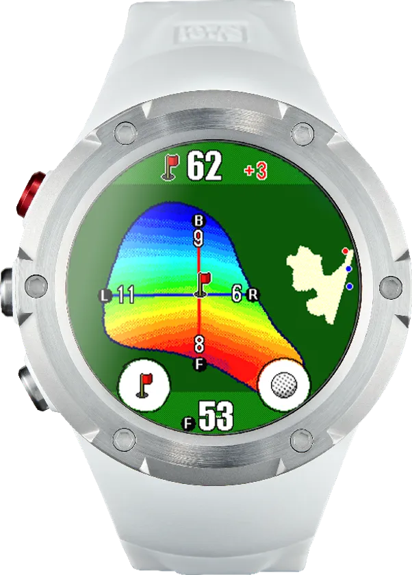 アプローチショット時に、グリーンのどこに落とせば次のパットが打ちやすいかを瞬時に見極める為に、グリーンの起伏を色別で表示する機能。