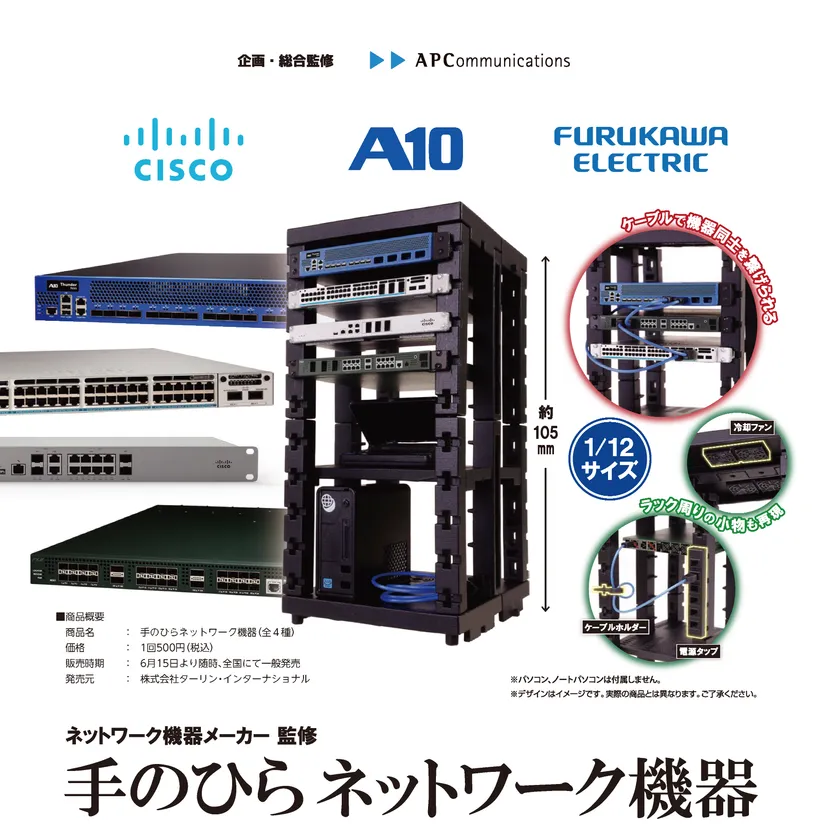 株式会社エーピーコミュニケーションズ(本社:東京都千代田区、代表取締役社長:内田 武志、以下 APC)、シスコシステムズ合同会社(本社:東京都港区、代表執行役員社長:中川 いち朗、以下 シスコ)、古河電気工業株式会社(本社:東京都千代田区、代表取締役社長:森平 英也、以下 古河電工)は、A10ネットワークス株式会社(本社:東京都港区、日本法人代表 兼 社長 米国本社ヴァイスプレジデント兼務:川口 亨、以下 A10)と共同で、株式会社ターリン・インターナショナル(本社:東京都台東区、代表取締役社長:佐藤 直志)が6月15日より随時販売を開始するカプセルトイ『手のひらネットワーク機器』の企画・監修をいたしました。