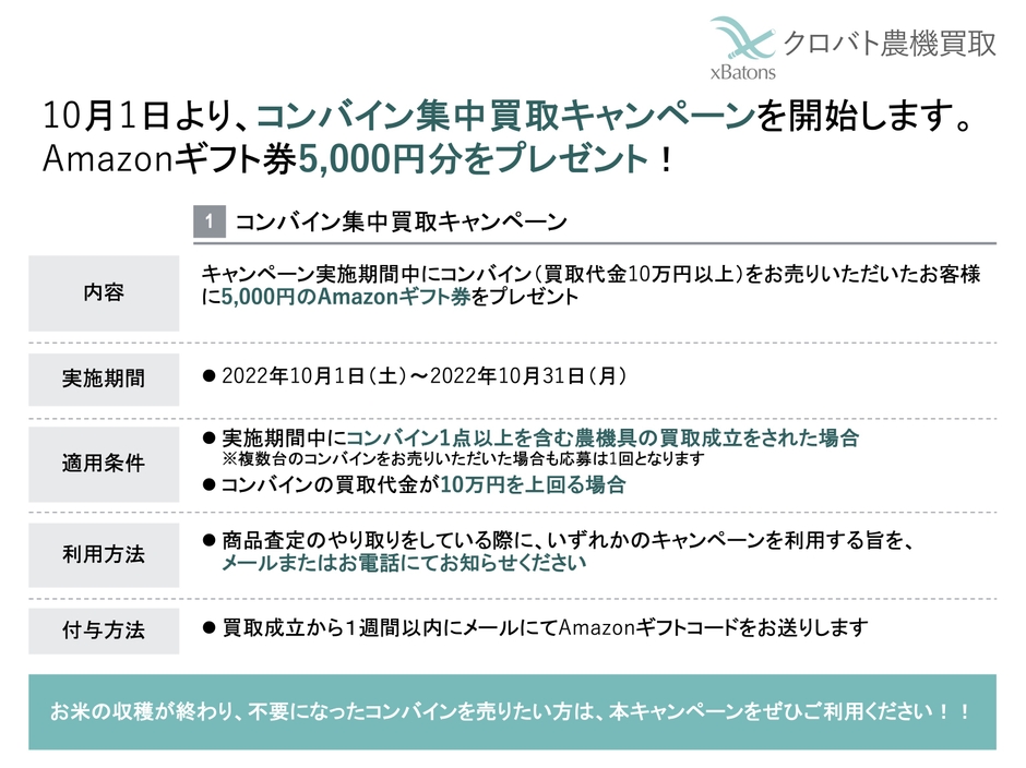 株式会社クロスバトンズ(本社:東京都板橋区、代表取締役社長:森 洋介)が運営するネット完結・非訪問型の農機具買取サービス「クロバト農機買取」は、22022年10月1日(土)〜2022年10月31日(月)の期間でコンバイン集中買取キャンペーンを実施します。