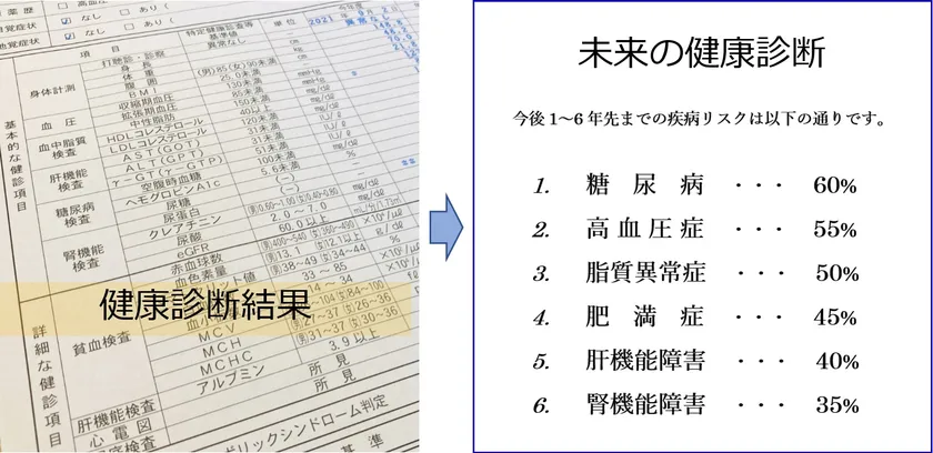 「未来の健康診断」とは、直近1回分の定期健康診断の結果から、今後1~6年先の生活習慣病のリスクを0~100%の数値で予測するサービスです。対象となる疾病は、糖尿病、高血圧症、脂質異常症、腎機能障害、肝機能障害、肥満症の6種類であり、経年変化や生活習慣なども加味して予測します。