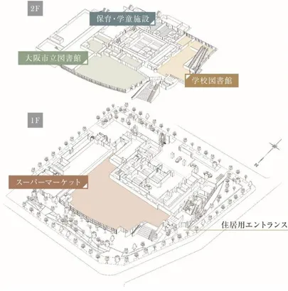 大阪市立図書館はオープンな空間とし、多世代が交流できる場となります。また、大阪市立図書館と同フロアに、学校法人履正社の運営する学校図書館が新設されます。この学校図書館の一部は、一般開放され、読書・カフェ・おしゃべり・学び・ミーティングなど、人々がさまざまな目的で利用できるようになりますので、大阪市立図書館と有機的につながるコミュニティの場となります。