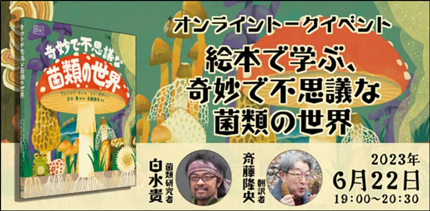 『奇妙で不思議な菌類の世界』の刊行を記念して、監訳者の白水 貴氏と訳者の斉藤 隆央氏をお招きしてトークイベントを開催します。専門家からも高い評価を得ている同書を題材に、刊行までの裏話、翻訳で苦労したこと、菌類の英名・学名・和名の関係、気候変動と菌類など、さまざまな角度から知られざる菌類の世界について語っていただきます。