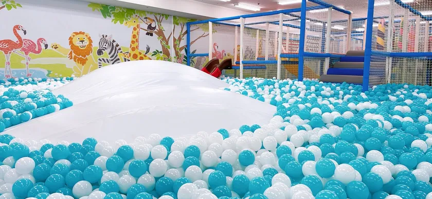 色とりどりのボールの海に白いふわふわのお山がクジラみたいで可愛いらしい、ぴょんぴょん飛び跳ねてもボールプールで泳いでも楽しい遊具です