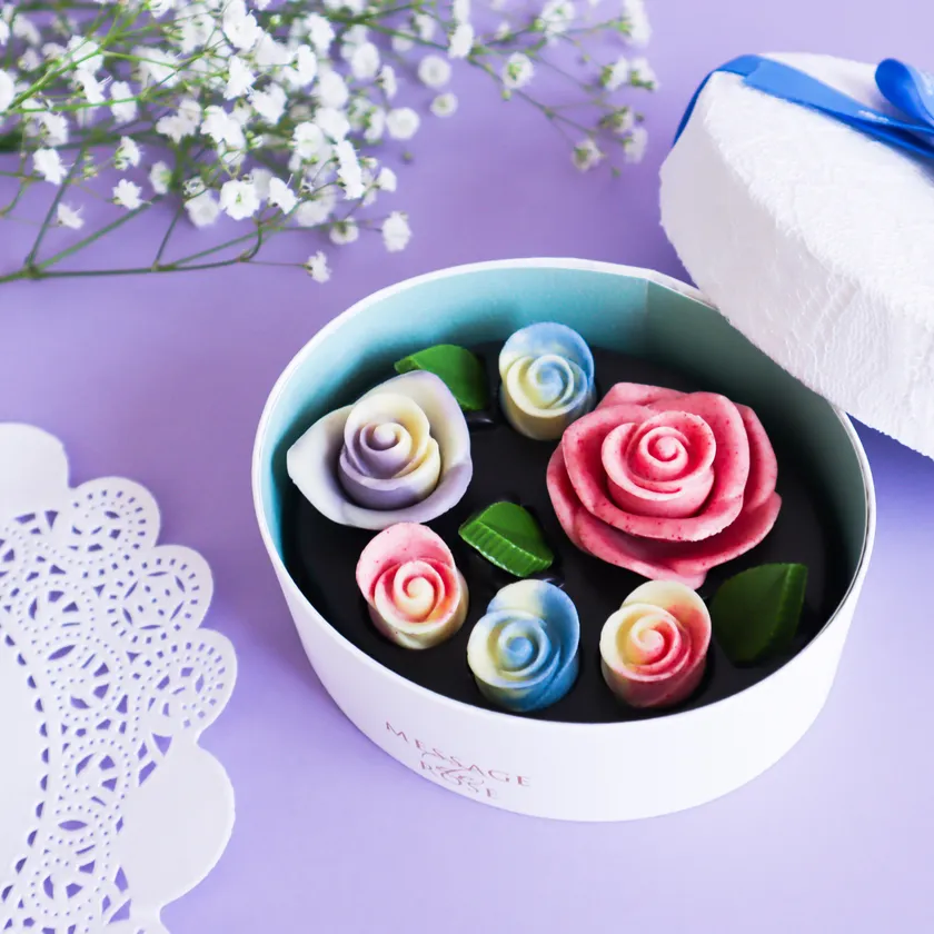 「あじさい」カラーをイメージした小さな可愛いバラのチョコレートを花束風に見立てた華やかなチョコレート。あじさいは、土壌の酸度(pH)によってお花の色が変わり、土壌が酸性だと青色、中性だと紫色、アルカリ性だとピンク色のお花が咲きます。ピンク、ラベンダー、ブルーの絶妙なカラーが、あじさいを彷彿とさせ、贈られた方も、もちろん選んだ方も喜んでいただける自信をもっておすすめできるチョコレートです。食べた瞬間、口の中に広がる濃厚でフルーティなチョコレートの味わいをぜひお楽しみ下さい。