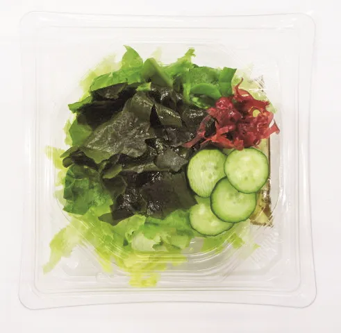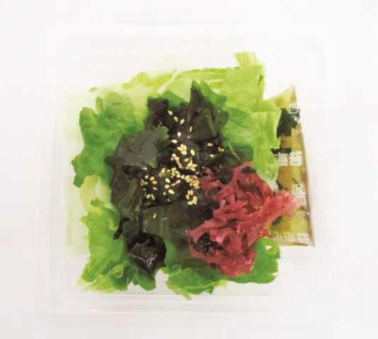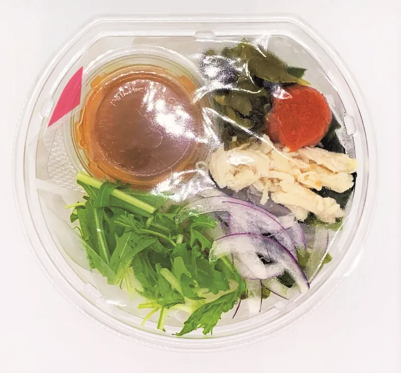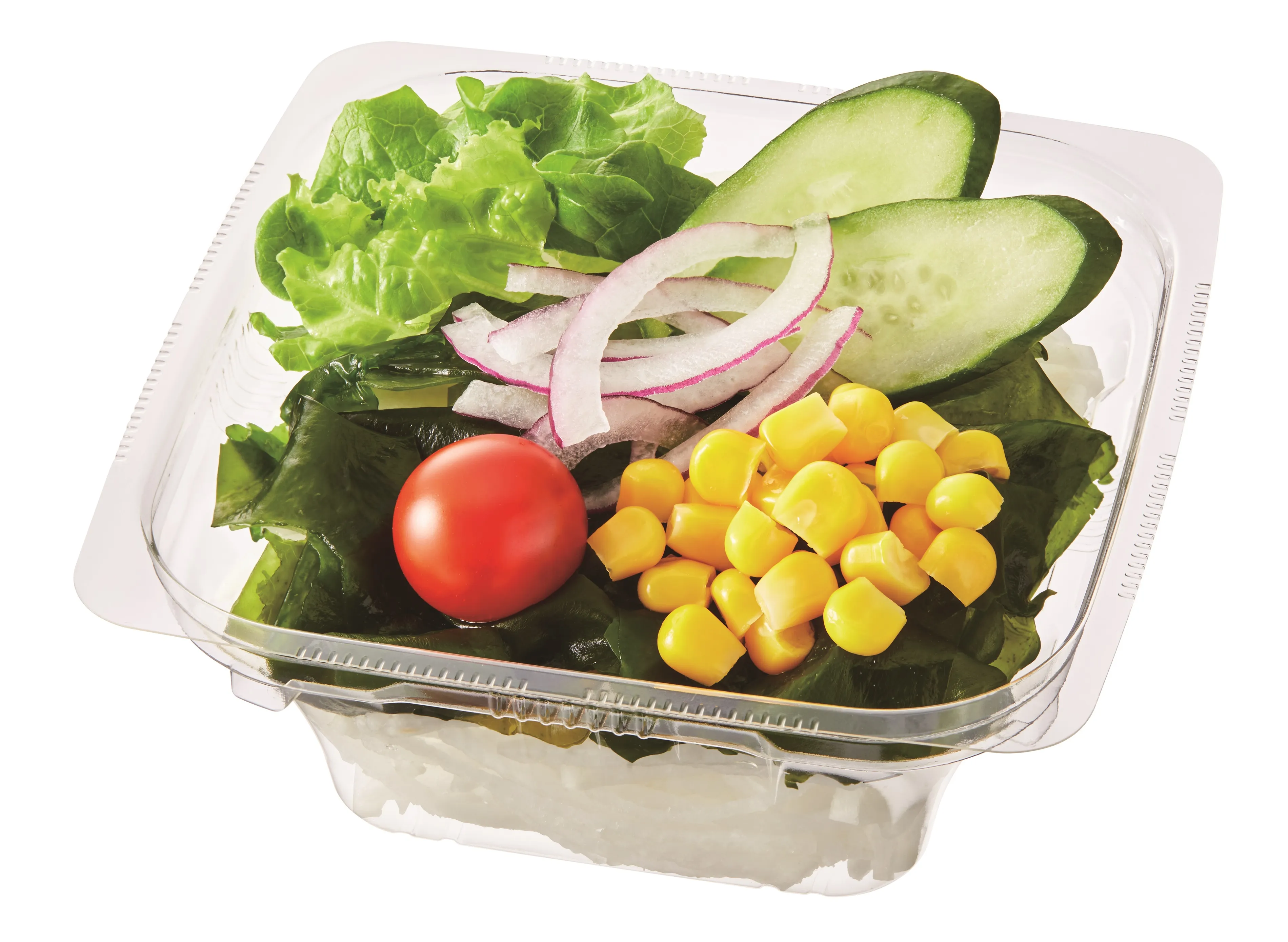 【内容】大根・わかめ・ミニトマト・グリーンリーフ・コーン・紫玉ねぎ・きゅうりの7種の具材を使用したサラダです。主食との付け合わせとしてもお買い求めいただきやすい商品です。