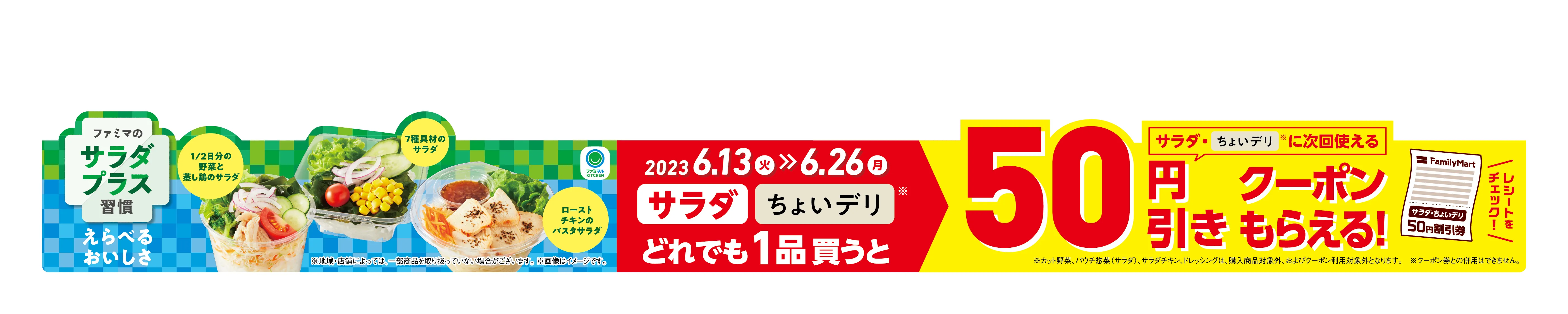 期間中、サラダ・ちょいデリ各種をご購入いただくと、次回会計で使える50円引きクーポンがもらえるキャンペーンを実施します。普段の食事においしくお得にサラダをプラスできるキャンペーンとなっています。(沖縄県を除く)