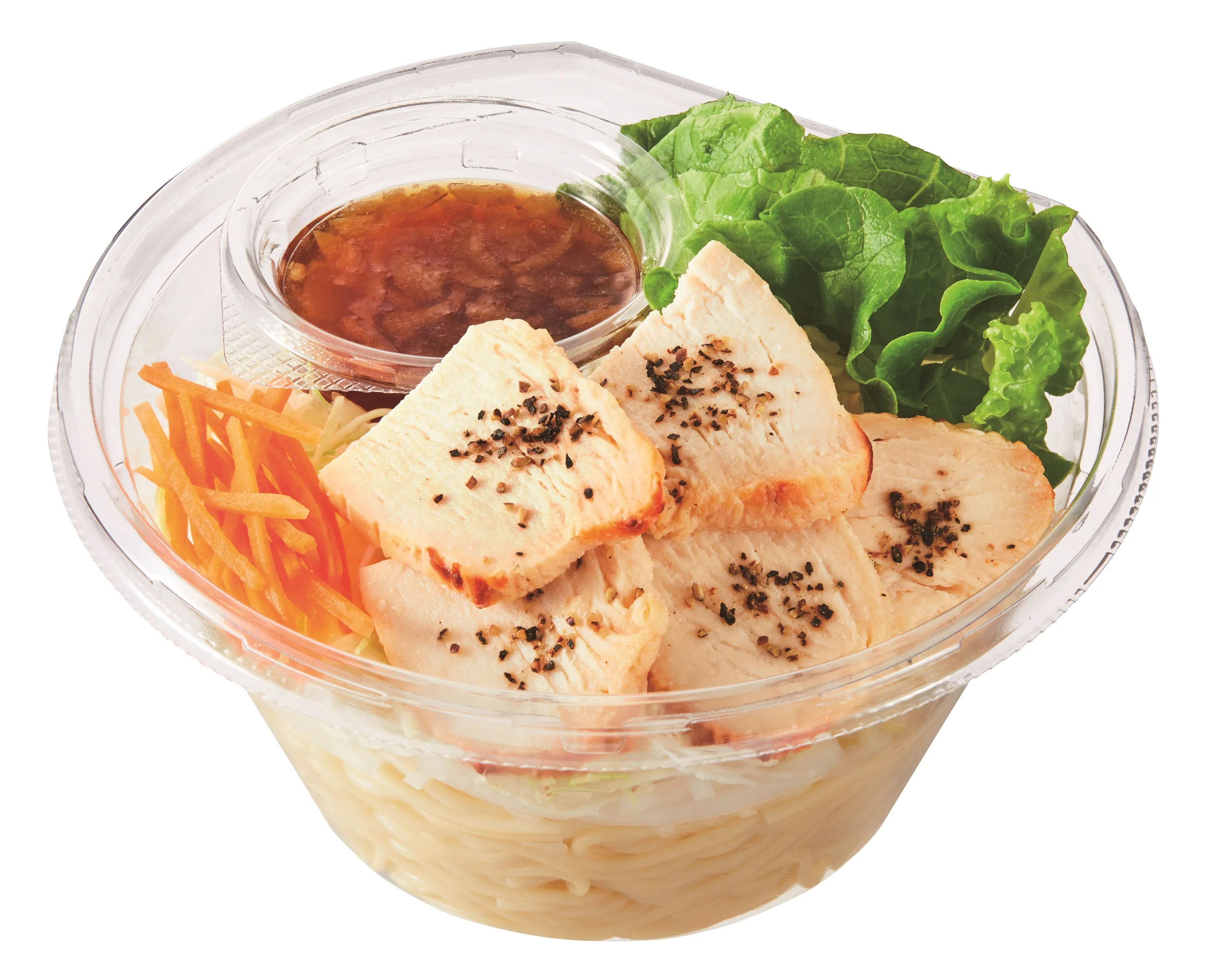 【内容】パスタサラダにしっとりとした鶏むね肉をトッピングし、野菜と一緒にたんぱく質が摂れます。ブラックペッパーをアクセントに、好評の「和風オニオンドレッシング」を使用しました。ビネガーを2種類(リンゴ酢+穀物酢) 使用することで、すっきりとしながらも深みある夏の仕立てにしています。