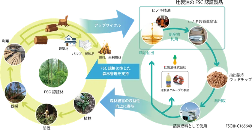 辻製油はとうもろこしや菜種から食用油を製造する搾油事業の他に、地元三重県産のヒノキの間伐材などからヒノキ精油を抽出し、アロマオイルや香水の原料として販売する事業を行っています。主に燃料用としてしか価値がないと考えられてきた間伐材を、原料用として適正な価格で購入し、自社の持つ油の抽出技術を活用することで、付加価値の高い“精油”という製品にアップサイクルし販売しています。森林経営の収益性を高めることで持続的な山林管理を促すと同時に、自社も持続的なビジネスを行うことが出来ます。また精油抽出後のヒノキのウッドチップは、自社の木質バイオマスボイラーの蒸気燃料として利用され、隣接する搾油工場を稼働させています。辻製油はこのヒノキ精油ビジネスを行うことで、顧客に価値ある製品を届けるとともに、地域の産業、そして環境保全にも貢献しています。