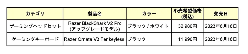 ゲーマー向けライフスタイルにおける世界のリーディングブランドのRazer(TM)(本社:米国 カリフォルニア州およびシンガポール、共同創業者兼CEO:Min-Liang Tan)は、「Razer BlackShark V2 Pro(アップグレードモデル)」を含む2製品を、2023年6月16日(金)より国内正規流通代理店 MSY株式会社を通じて、全国の家電量販店、PCショップ、オンラインショップ等で販売開始いたします。