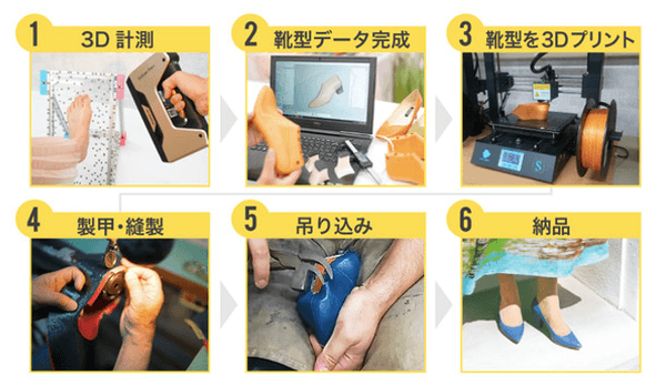 「AYAME」(あやめ https://hana-ayame.info/ )は、最新の3Dプリンタの技術を使い、短期間でオーダーメイドのパンプスや紳士靴、スニーカーを制作し、それらをメンテナンス付きのサブスクリプションモデルで提供するサービスです。パンプスは約6,400万通り、スニーカーは約17億通り以上のデザインの中からお客様の好みにあった1足を製造し、お届けします。サイズについては、ひとりひとりの足に合わせて靴型を個人専用に3Dプリントして作るので、ほぼ無制限となるサイズ展開を実現しています。