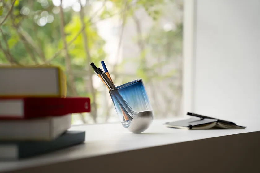 SESEKIは暮らしにささやかな変化をつくる入れ物です。鋳鉄の重みを活かすことで起き上がりこぼしのような動きをします。お気に入りのペンが一本増えたり、ものの入れ方を変えるだけでも、傾きが変わります。また花瓶として使う時には植物の成長によって傾きが変化し、新たな表情を発見できるかもしれません。毎日の机の上や棚の上にふとしたことで変化がおきる。それがSESEKIです。
