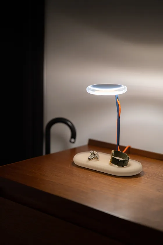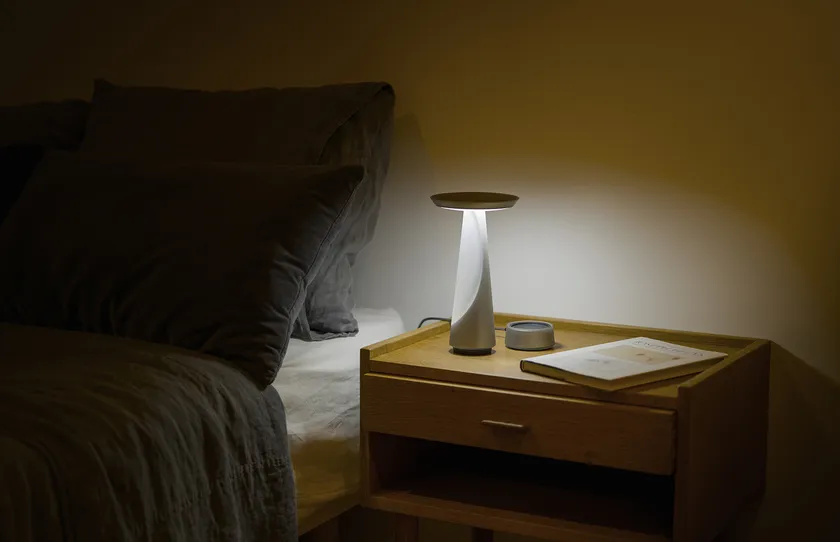 KIRUNAの特徴は、鋳鉄を半月のような形の樹脂と組み合わせた支柱にあります。上部から照らし出される光が樹脂部を通してほのかに明るく鋳鉄部分が影になることで、見る向きや置く方向によって、彫刻のように様々なカタチや光を見せてくれます。充電式のバッテリーが内蔵されており、いろいろな場所に移動ができ、明るさを調整することによってベッドサイドや食卓などシーンに合わせてお使いいただけます。