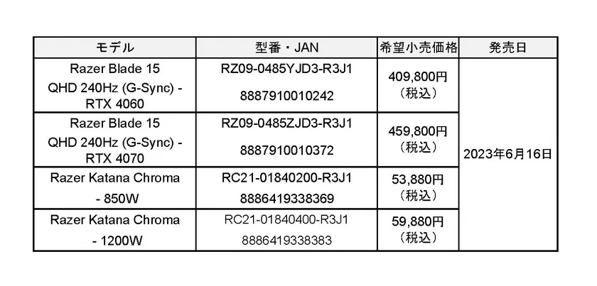 ゲーマー向けライフスタイルにおける世界のリーディングブランドのRazer(TM)(本社:米国 カリフォルニア州およびシンガポール、共同創業者兼CEO:Min-Liang Tan)は、「Razer Blade 15」と「Razer Katana Chroma」の合計4製品を2023年6月16日(金)より国内正規流通代理店 株式会社アユートを通じて、全国の家電量販店、PCショップ、オンラインショップ等で販売いたします。