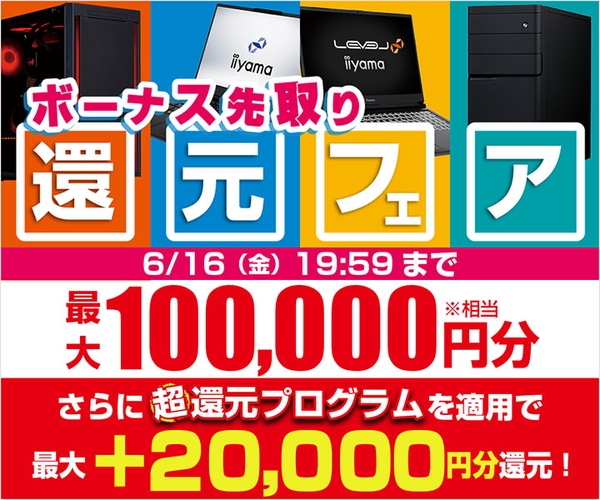 パソコン工房WEB会員またはビジネスご優待会員にご登録の上、期間中に指定金額以上のiiyama PCをお買い上げいただいた方に、最大10万円分相当のWEBポイントを還元いたします。
