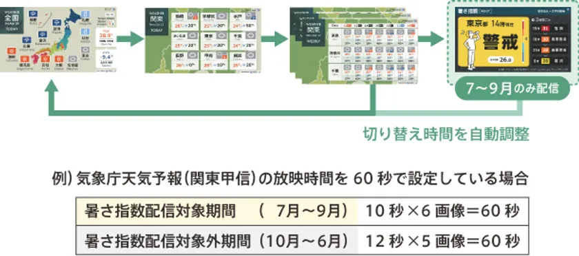 気象庁の天気予報(特別警報・警報付き)と暑さ指数[WBGT]をセットでご提供。暑さ指数の配信対象期間(7月1日~9月30日)は、天気予報の表示時間を自動的に短縮し、暑さ指数を放映します。
