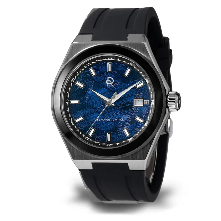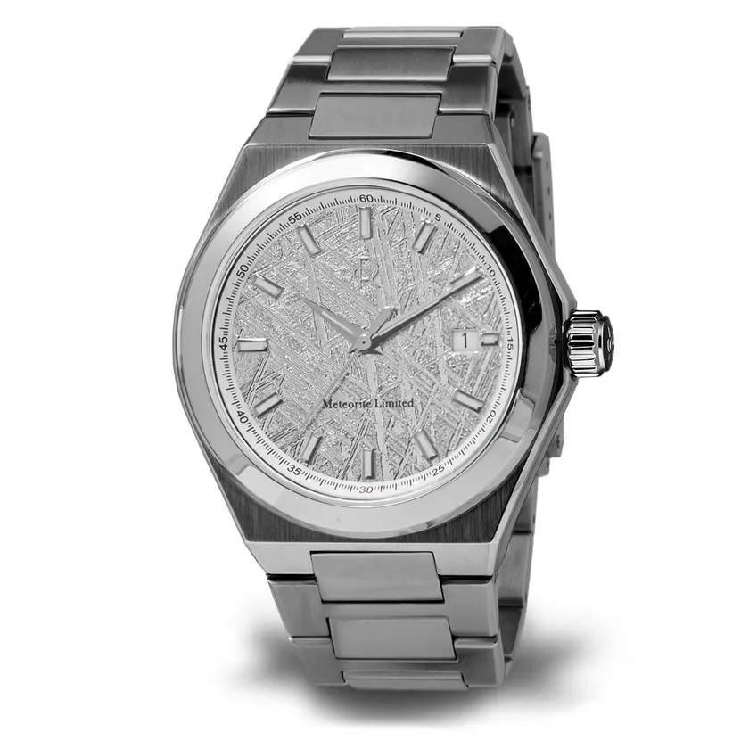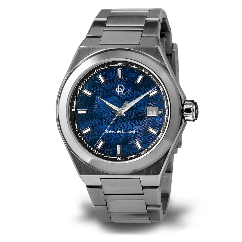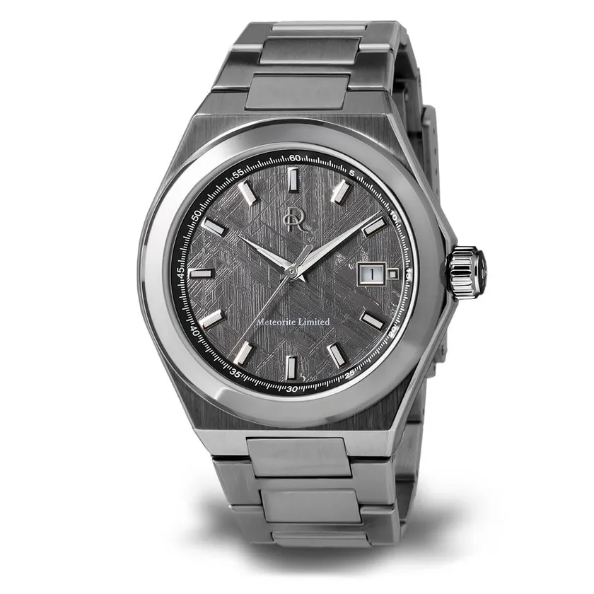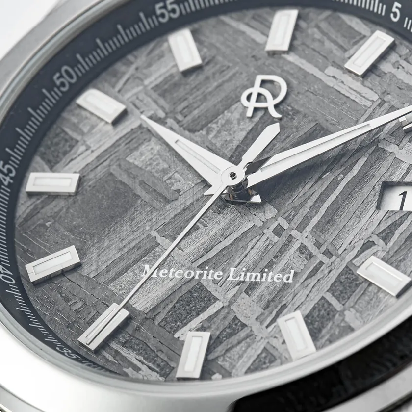希少なメテオライト(隕石)を僅か0.4mmにカットした文字盤と信頼のスイス・ETA製のデイト表示を搭載して、さらに最高の輝きを持つ「904Lステンレススチール」のシームレスな外装ケースを纏っています。