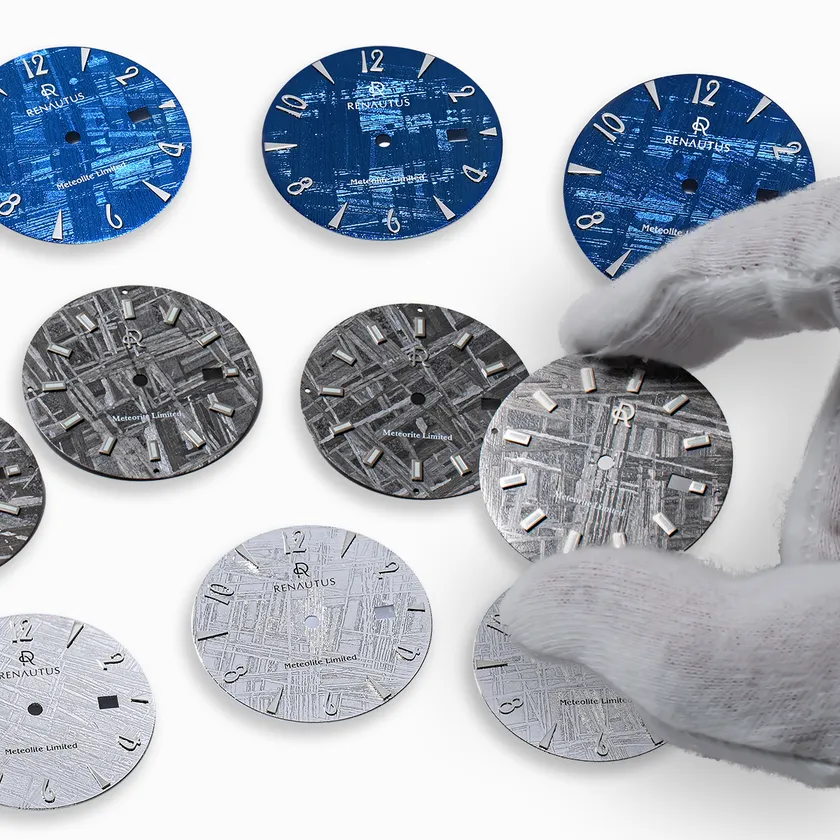 今回発売されるメテオライト文字盤には、ナチュラルの他に、前回大変人気だったシルバーとブルーのカラーコーティングをご用意しました。