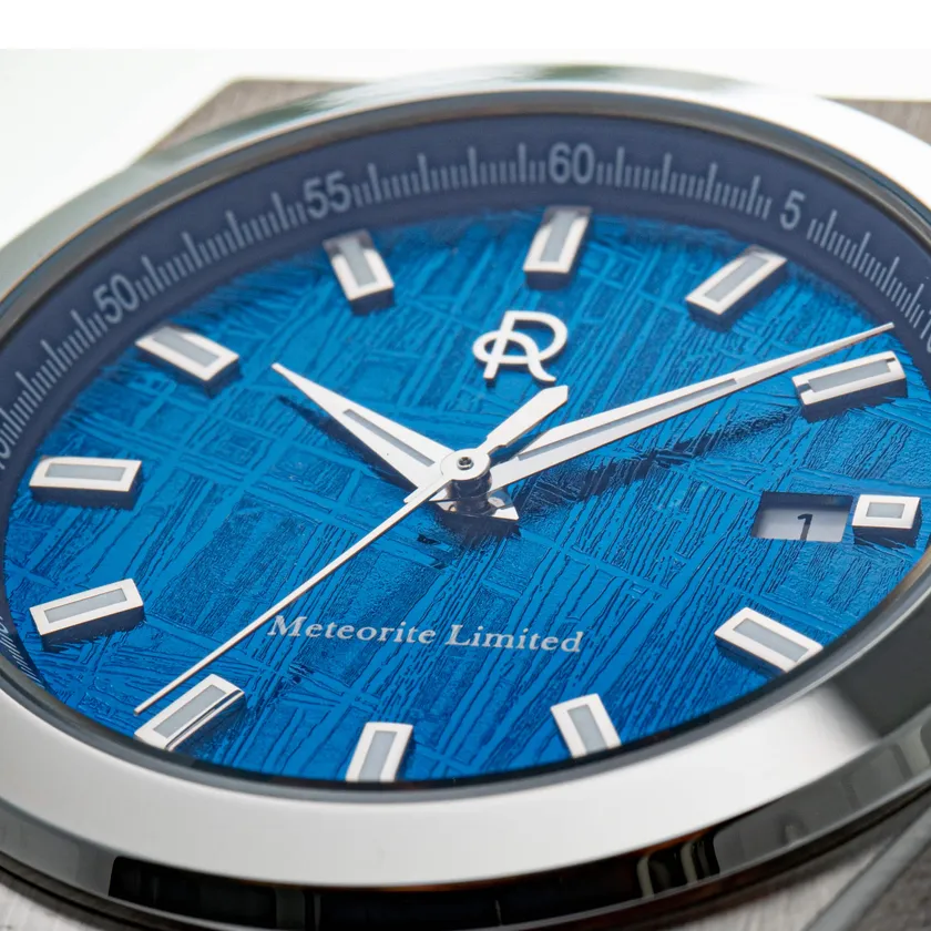 ブルーモデルは、ブルーコートを施すことで隕石特有の模様を残しつつ深みのある青が印象的な宇宙を感じることが出来る文字盤に仕上げました。