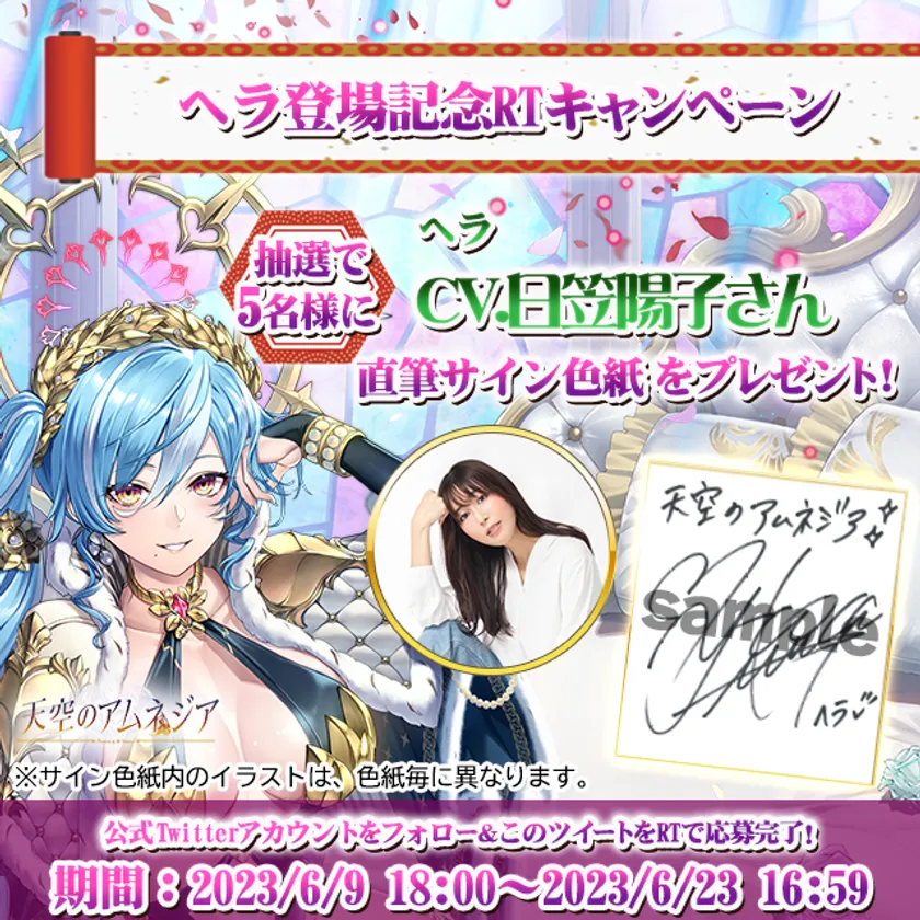 株式会社エムスタイル(所在地:東京都渋谷区、代表取締役:米島祐介)は、iOS/Android端末用スマホRPG「天空のアムネジア」の新英雄キャラクター「ヘラ」リリースに伴い、声優を務める「日笠陽子」さんの直筆サイン色紙が当たるプレゼントキャンペーンを2023年6月9日(金)18:00より開催いたします。