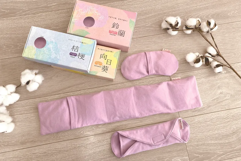 商品開発には社内の各部署から年齢も異なる女性社員6名と男性社員1名で構成されたプロジェクトチーム。実際に悩みを抱える女性社員たちが当事者目線で開発を進めました。第1弾として3種類の冷温兼用ジェルパックを開発。5連結のジェルパックでお腹や腰などに使用する「鈴蘭」、耳裏や胸・眼などに使用するまめ型の「向日葵」、陰部に当てる「桔梗」の3種類で、冷凍庫で冷やしたり、電子レンジやお湯で温めて、生理痛や産後の痛みに使用できます。