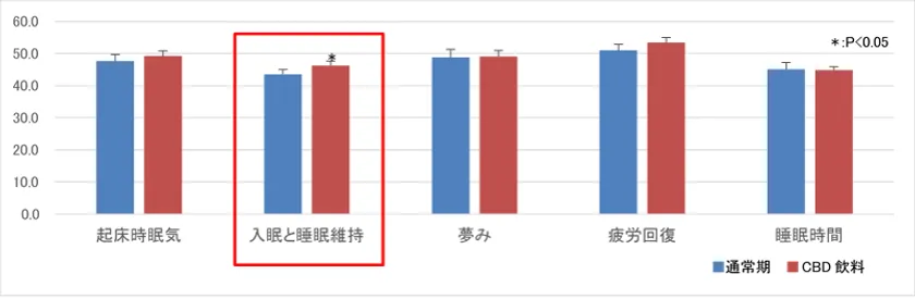 CBD飲料摂取期間の方が入眠と睡眠の維持の項目において有意にスコア改善