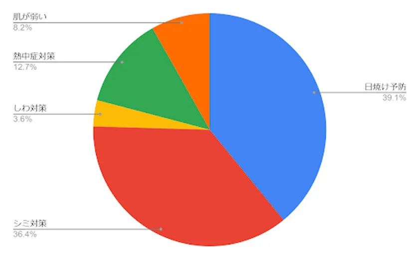 また、紫外線対策には日傘以外にも帽子やサングラス、UVカット機能の衣服などを利用する人々も多く、その主な理由としては日焼け予防やシミ対策が挙げられます。