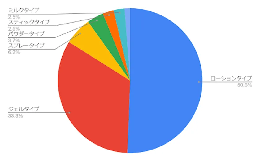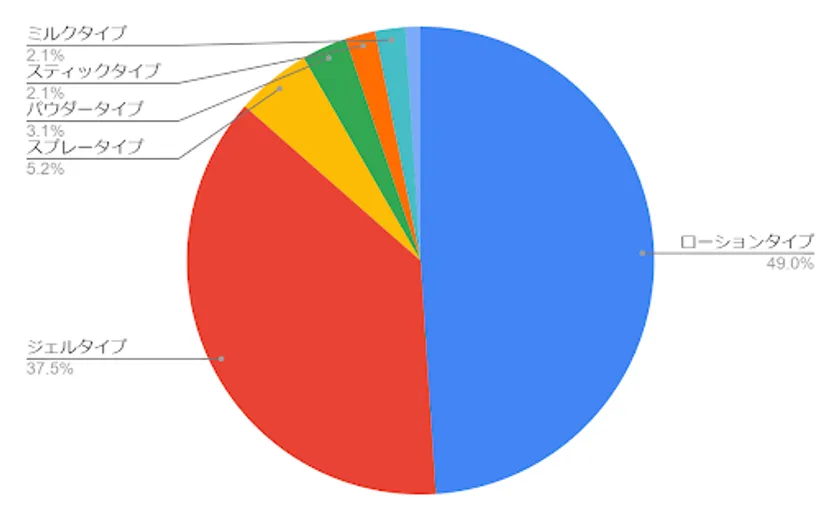 ローションタイプが49%と最も人気で、つづいてジェルタイプが37.5%で2番目に人気であることがわかりました。スプレータイプやスティックタイプの日焼け止めも便利ですが、メインづかいには不向きなことが予想されます。