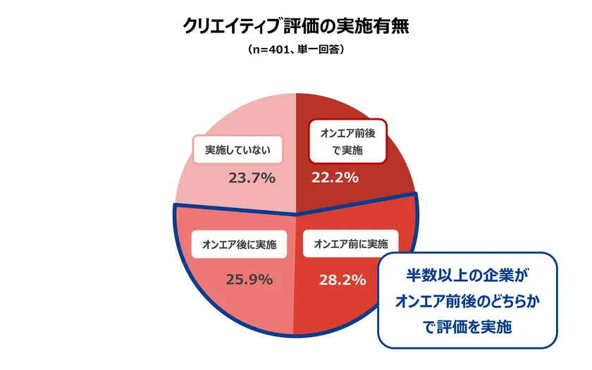・クリエイティブ評価の実施形態は、テレビCMのオンエア前後どちらか一方のみで評価を行う企業が過半数