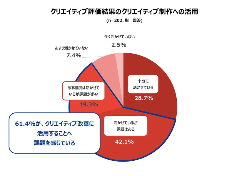 ●およそ9割の企業が評価結果をクリエイティブ改善に活用していると回答した一方、十分に活用できていると回答した企業はおよそ3割にとどまり、およそ6割の企業が評価結果のクリエイティブ改善への活用に課題を抱えていました。