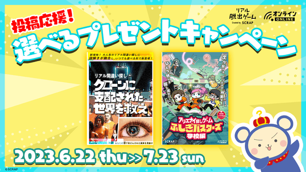 また解禁とあわせて「投稿応援! 選べるプレゼントキャンペーン」も開催。キャンペーン期間中にオンラインリアル脱出ゲームに関する動画やテキストを投稿し、専用フォームから必要事項を記入し応募していただいた方に、SCRAPのオンライン作品『リアル間違い探し クローンに支配された世界を救え』または『ふしぎバスターズ 学校編』のどちらか希望の作品をプレゼント。