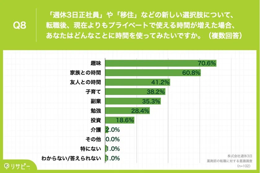 Q8.「週休3日正社員」や「移住」などの新しい選択肢について、転職後、現在よりもプライベートで使える時間が増えた場合、あなたはどんなことに時間を使ってみたいですか。(複数回答)」(n=102)と質問したところ、「趣味」が70.6%、「家族との時間」が60.8%、「友人との時間」が41.2%という回答となりました。