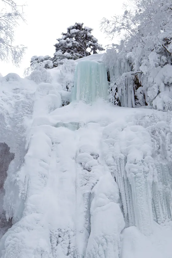 深い雪に閉ざされた森の中に現れる氷瀑の絶景