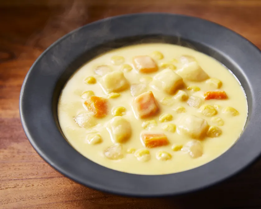 北海道産のスイートコーンと国産の野菜を使用した具だくさんで食べ応えのあるコーンチャウダーです。