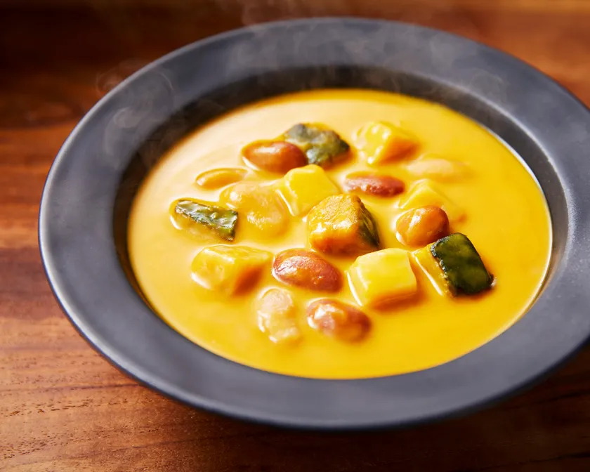 かぼちゃをたっぷり使用した濃厚スープです。具材には、ダイスカットの北海道産かぼちゃを加え、スープ自体には北海道産かぼちゃペーストを使用しています。バターとクリームでコクを出し、クリーミーに仕上げました。具材にはかぼちゃのほかに、国産のじゃがいも、赤いんげんまめ、白いんげんまめを使用しています。