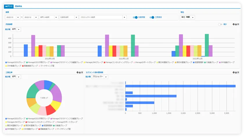 プロジェクト別・部署別・人別などの分析軸から工数を集計し、グラフ化させることができます。