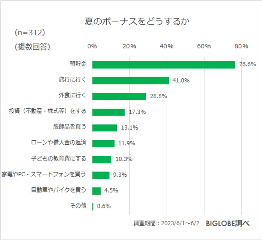 さらに、「夏のボーナスをどうするか」については、「預貯金」(76.6%)が8割弱と最も多く、次いで「旅行に行く」(41%)、「外食に行く」(28.8%)となった。